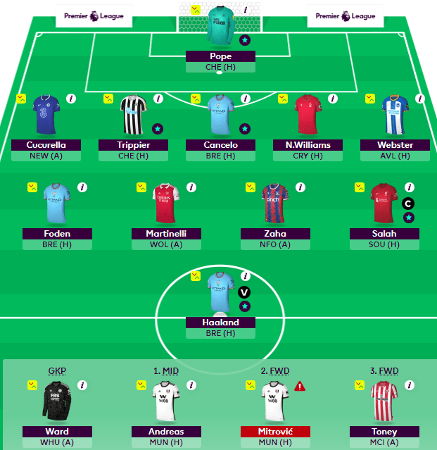 Huruvida Haaland kommer starta mot Brentford är osäkert och därför väljer vi denna vecka att inte ta några risker. Vi byter därför ut Saka för att ha råd att få in Salah. Liverpool står i 1.26 att vinna mot Southampton och med tänka på Salahs nuvarande form har vi goda chanser på poäng här.